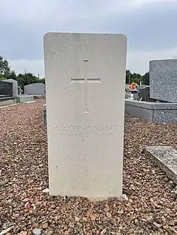 | Bernard Ernest Wellum | 11 July 1921 | Albert Communal Cemetery Extension | Died age 25. During the Great War, he served with the Royal Army Medical Corps.[4] His grave is unusual in that it is a standard CWGC war dead headstone, as opposed to the flat-topped stone or post war/civilian type stone.[5] | ![]() |