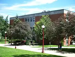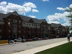 McCarthy Hall and University Towers sit adjacent to one another and next to the Suites on Pratt. The four-story McCarty Hall houses about 150 students in dormitory rooms.[40] However, it was closed in 2013 with plans to be demolished in the summer of 2016. Plans are not yet finalized for what will replace the former residence hall.[41] University Towers is the university's only apartment building and is open to upperclassmen and graduate students, with each room having a kitchen. The University Police are headquartered on the first floor of the building.[42]