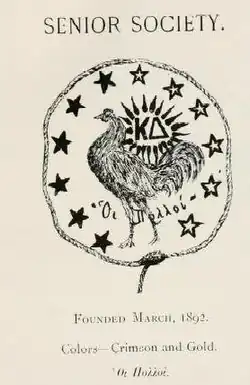 The Senior Society was another upperclassman secret society that was founded in 1892. As the name implies, membership was restricted to only eleven newly tapped seniors who revealed themselves at the end of the spring semester. Their exact purpose was unknown, but similar to most senior societies, membership was based on loyalty to the university, academics, and prevalence on campus. Their actual name is thought to be known only to members and incorporates the Greek letters " Delta". Their crest, which consists of a rooster and twelve stars appears in other photos and texts in the University Archives. Their motto is οἱ πολλοί (hoi polloi), which roughly translates to "The Masses". The phrase became known to English scholars probably from Pericles' Funeral Oration, as mentioned in Thucydides' History of the Peloponnesian War. Pericles uses it in a positive way when praising the Athenian democracy, contrasting it with hoi oligoi, or oligarchy. During this time, many student groups tended to embrace similar philosophies and were against the centralization of power in the Student Council. Their current existence is speculated, but unconfirmed.[17]