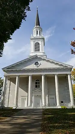 Middlebury Chapel 1916[2] Chapel for formal events; built in the style of a traditional New England meeting house combined with the marble of the American neoclassical style. Above the colonnade is a quote from Psalm 95, "The strength of the hills is His also." Also has an 11-bell carillon.[2]