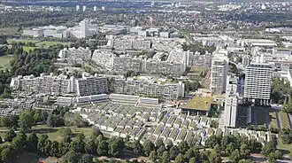 The Olympic Village in Munich was built close to the Olympic Stadium and comprised around 1,940 apartments. It had three zones: the men's village, the women's village, and the central zone. Most facilities were located in the central zone, including shops, restaurants, cafés, a bank, a post office, a medical center, a hairdresser, a pharmacy, a laundry, a sewing workshop and a cobbler, among others. The village included a garden with a miniature golf course and a shuttle system transported Olympians around the village. On 5 September 1972, the village was the target of the Munich massacre, a terrorist attack by the Black September Organization in which eleven Israeli athletes and one German police officer were killed. Part of the village is now the Studentenviertel Oberwiesenfeld student residency. [1][2]