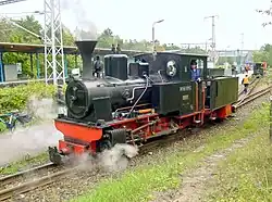 0-4-0 | 1,000 mm (3 ft 3+3⁄8 in) | 125 hp | Two-cylinder compound locomotive with two coupled axles. Supplied to the Ruhr-Lippe-Kleinbahnen. Steam bell, vacuum brake (König system), central lubrication device | |