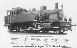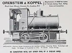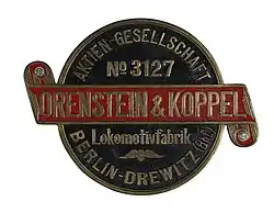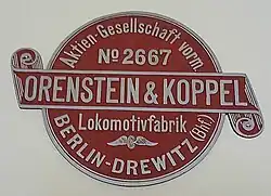 The list of Orenstein & Koppel steam locomotives shows photographically documented samples of representative Orenstein & Koppel (O&K) steam locomotives. The factory produced 14,387 steam locomotives from 1899 to 1945 at its Berlin site (Drewitz, Nowawes, Babelsberg) with the works number range from 337 to 12965.