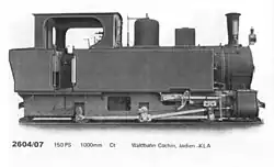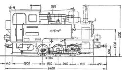 0-6-2 | 750 mm (2 ft 5+1⁄2 in) | 100 hp | Two-cylinder locomotive with three coupled axles and one radial axle. Steam bell, outer frame, upper water tanks. Delivered to the Rosenberger Kreisbahn |