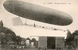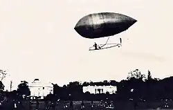 No. 5 (airship) – Built to make an attempt on the Deutsch de la Meurthe prize for a flight from the Aero-Club de France's flying field at Saint-Cloud to the Eiffel Tower and back within 30 minutes. Used the enlarged envelope from No. 4, from which an elongated triangular-section gondola made of pine was suspended. Other innovations included the use of piano wire to suspend the gondola, greatly reducing drag and the inclusion of water ballast tanks. Powered by a 12 hp 4-cylinder inline air-cooled engine driving a pusher propeller.[18] First flown on 11 July 1901: a lengthy flight was made the next day and an attempt on the de la Meurthe prize on the 13th: the outward flight was accomplished in ten minutes, but the return was hampered by a headwind and took half an hour. On reaching St Cloud the engine failed and the airship was blown into the surrounding trees, damaging the envelope. A second attempt on the prize was made on 8 August but ended in disaster: after reaching the Tower in eight minutes, the airship began losing hydrogen because of a faulty valve. The partial deflation of the envelope caused some of the suspension wires to foul the propeller: Santos-Dumont, therefore, stopped the engine leaving the craft not only unpowered but without any means of inflating the ballonet to maintain the shape of the envelope. Helpless, the craft was blown back towards the Tower and blown onto the roof of the Trocadero Hotel, bursting the envelope with a noise described in some press reports an explosion but which Santos-Dumont likens to a paper bag being burst. Santos-Dumont was left precariously suspended above the courtyard of the hotel but was rescued by the Paris fire brigade. The airship was damaged beyond repair: only the engine was salvaged.[19]
