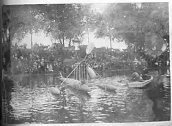 No. 7 (airship) – A fast competition airship, built to compete for the aviation prizes on offer at the 1904 St Louis World's Fair. Before the competition the airship's envelope was sabotaged, preventing it from competing.[21] It had a double-thickness varnished silk envelope, 50 m (160 ft) long, 7.92 m (26.0 ft) diameter: capacity 1260 m3 (44,500 ft3), and was powered by a 60 hp water-cooled engine, driving two propellers, one at the front and one at the rear of the gondola.[22]