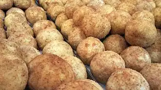 Arancini or arancine stuffed rice balls which are coated with breadcrumbs and fried. They are said to have originated in Sicily in the 10th century during Kalbid rule.