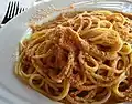 Pasta chi Vrocculi Arriminati a pasta dish from Palermo which generally consists of a long pasta like spaghetti or bucatini, cauliflower, onion, raisins, anchovies, pine nuts, saffron, red chili, and breadcrumbs