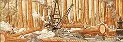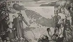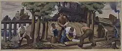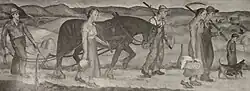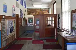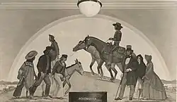 From 1934 to 1943, the Procurement Division of the United States Department of the Treasury commissioned murals in post office buildings across the country. Part of the New Deal, the stated objective of commissioning United States post office murals was to secure artwork that met high artistic standards[2] for public buildings, where it would be accessible to all people.[3] The murals were intended to boost the morale of the American people suffering from the effects of the Depression by depicting uplifting subjects the people knew and loved.[4] Murals produced through the Treasury Department's Section of Painting and Sculpture (1934–1943) were funded as a part of the cost of the construction of new post offices, with 1% of the cost set aside for artistic enhancements.[5] Murals were commissioned through competitions open to all artists in the United States.[6] Almost 850 artists were commissioned to paint 1,371 murals, most of which were installed in post offices;[5] 162 of the artists were women and three were African American.[5] The Treasury Relief Art Project (1935–1938), which provided artistic decoration for existing Federal buildings, produced a smaller number of post office murals.[2] TRAP was established with funds from the Works Progress Administration. The Section supervised the creative output of TRAP, and selected a master artist for each project. Assistants were then chosen by the artist from the rolls of the WPA Federal Art Project.[7]: 62–63