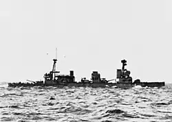 Hood, however, was sufficiently advanced in construction that she was completed in 1920 and immediately became flagship of the Battlecruiser Squadron of the Atlantic Fleet. In 1923–24 Hood, accompanied by Repulse and a number of Danae-class cruisers, sailed around the world from west to east via the Panama Canal. On 23 April 1937, after the beginning of the Spanish Civil War, she escorted three British merchantmen into Bilbao harbour despite the presence of the Nationalist cruiser Almirante Cervera that attempted to blockade the port.[39] Hood spent most of the early part of the Second World War patrolling against German commerce raiders and escorting convoys. As flagship of Force H based at Gibraltar, she bombarded French ships during the attack on Mers-el-Kébir. In May 1941 Hood and the battleship Prince of Wales were ordered to intercept the German battleship Bismarck and the heavy cruiser Prinz Eugen as they attempted to break out into the North Atlantic. In the subsequent Battle of the Denmark Strait Hood's aft magazines exploded, sinking her within five minutes of the start of the battle.[40]
