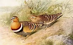 Sandgrouse have small, pigeon like heads and necks, but sturdy compact bodies. They have long pointed wings and sometimes tails and a fast direct flight. Flocks fly to watering holes at dawn and dusk. Their legs are feathered down to the toes.