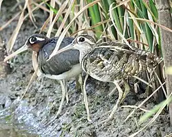 Painted-snipes are short-legged, long-billed birds similar in shape to the true snipes, but more brightly coloured.