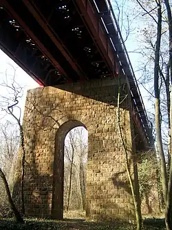 A railway bridge located in the district of Mlynská Dolina crossing the spring valley of Vydrica stream. It was built in 1848. It is 215 metres long. Originally, it was a brick bridge supported by nine arches until the German army destroyed it in 1945, with a fragment of a pillar remaining intact. The current bridge was rebuilt in 1948 in a steel version, carrying the same name and painted red. This railway bridge is a part of the historically important railway route connecting Bratislava with Vienna.[14]