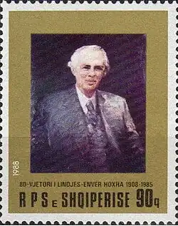 The long-time ruler of Communist Albania, Enver Hoxha, had what the OECD called "an overwhelming cult of personality and an ultra-centralized, authoritarian form of decision-making".[5] Hoxha was widely portrayed as a genius who commented on virtually all facets of life from culture to economics to military matters. Statues of him were erected in cities. Textbooks were required to include quotations of his about their particular subjects. The ruling party of the time, the Party of Labour of Albania, granted him honorific titles such as Supreme Comrade, Sole Force and Great Teacher.[6] When Hoxha died in 1985, Ramiz Alia took power. Robert D. McFadden of The New York Times wrote that Alia's policies of liberalization were "too little, too late", and the country descended into civil war. Alia served one year in prison for corruption, but the anarchy prevented further charges from being filed against the former Communist regime.[7]