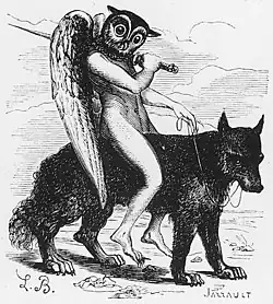 2. Aamon[5] (or Amon, Nahum) is a Marquis of Hell who governs forty infernal legions. He appears as a wolf with a serpent's tail who can breathe fire, or as a man with a raven's head, sometimes depicted with canine teeth. He tells of all things past and future. He procures feuds, and reconciles controversies between friends and foes.