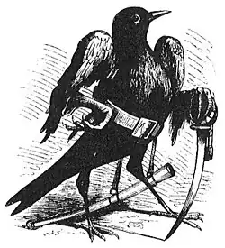 9. Camio (also Caim, Caym) appears in Ars Goetia, the first part of The Lesser Key of Solomon as a Great President of Hell, ruling over thirty legions of demons. Much detail is offered: he is a good disputer, gives men the understanding of the voices of birds, cattle, dogs, and other creatures, and of the noise of the waters too, and gives true answers concerning things to come. He is depicted in 19th and 20th century occultist illustrations as appearing in the form of the black bird called a thrush, but soon he changes his shape into a man that has a sharp sword in his hand. When answering questions he seems to stand on burning ashes or coals. He is a nocturnal demon that is most powerful during the month of December.[26]