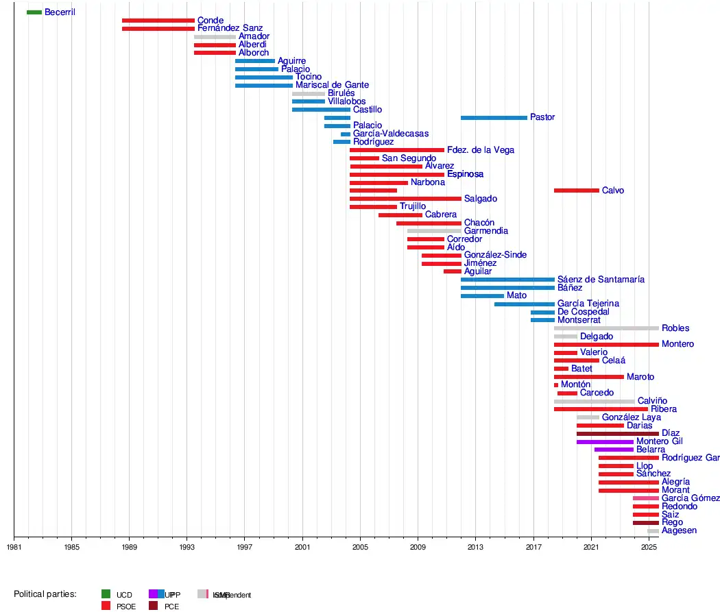 Sara AagesenSira RegoElma SaizAna Redondo GarcíaMónica GarcíaDiana MorantPilar AlegríaRaquel Sánchez JiménezPilar LlopIsabel Rodríguez GarcíaIone BelarraIrene MonteroYolanda DíazCarolina DariasArancha González LayaTeresa RiberaNadia CalviñoMaría Luisa CarcedoCarmen MontónReyes MarotoMeritxell BatetIsabel CelaáMagdalena ValerioMaría Jesús MonteroDolores DelgadoMargarita RoblesDolors MontserratMaría Dolores de CospedalIsabel García TejerinaAna MatoFátima BáñezSoraya Sáenz de SantamaríaRosa AguilarTrinidad JiménezÁngeles González-SindeBibiana AídoBeatriz CorredorCristina GarmendiaCarme ChacónMercedes CabreraMaría Antonia TrujilloElena SalgadoElena EspinosaCarmen CalvoCristina NarbonaElena EspinosaMagdalena ÁlvarezMaría Jesús San SegundoMaría Teresa Fernández de la VegaElvira RodríguezJulia García-ValdecasasAna PalacioAna Pastor JuliánPilar del CastilloCelia VillalobosAnna BirulésMargarita Mariscal de GanteIsabel TocinoLoyola de PalacioEsperanza AguirreCarmen AlborchCristina AlberdiÁngeles AmadorMatilde Fernández SanzRosa CondeSoledad Becerril
