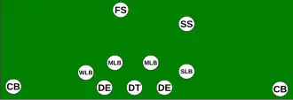 The 3–5–3 refers to a defense that has three down linemen (the "3" level), three linebackers and two corners (the "5" level), one free safety and 2 strong safeties (the "3" level). This is similar to a 33 stack, but with players more spread. Also called the "umbrella" defense or "3-deep". In this set, the third safety would be referred to as a "weak safety" (WS) and allows two position safeties at the mid-level with a third safety deep. It is because of this that the secondary safety in a football defense is called a free safety rather than a weak safety