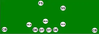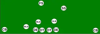 The 33 stack uses an extra strong safety, and "stacks" linebackers and safeties directly behind the defensive linemen.