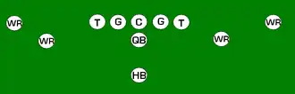 One variation of the T Formation would be where all the running backs would be closer than usual, being at fullback depth rather than halfback depth. Another variation of the "balanced T" formation is the so-called "unbalanced T" formation.[2] In this configuration the line of scrimmage has an end and tackle left of center, while to the right of the center are two guards, a tackle, and an end. This creates a line that is weighted toward the right of the center. With the backfield lining up in the conventional T formation behind the center (quarterback, two halfbacks and fullback), the resulting configuration is "unbalanced" due to the asymmetry of the placement of the linemen. The "split T" spreads the offensive line out over almost twice as much ground compared to the conventional T formation. This causes the defensive line to also spread out, creating gaps the offense can exploit.[3]