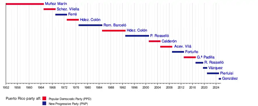 - ^ a b The continuous tenure of Luis Muñoz Marín was authorized under the Jones–Shafroth Act of 1917 and the Elective Governor Act of 1947 from January 2, 1949 to July 25, 1952, and under the Constitution of Puerto Rico from July 25, 1952 to January 2, 1965. Muñoz Marín became the first popularly elected governor of Puerto Rico through the 1948 Puerto Rican general election.