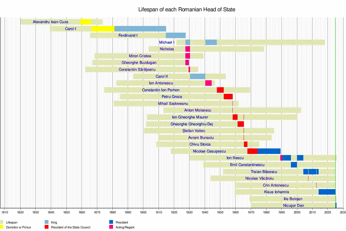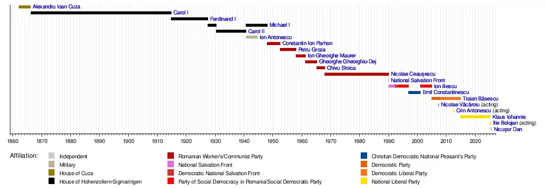 - ^ Bolojan acted as President after Iohannis' resignation on 10 February 2025, that took effect on 12 February 2025; he served until the conclusion of the 2025 presidential election.