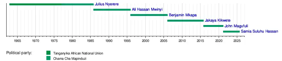 1 November 1964 | 5 November 1985 | 21 years, 4 days | TANU (until 1977) |