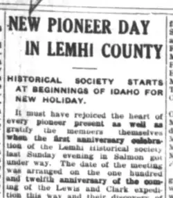 1. ^ "New Pioneer Day in Lemhi County", The Idaho Recorder, Salmon, Idaho, August 17, 1917 – via Library of Congress' Chronicling America