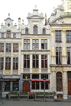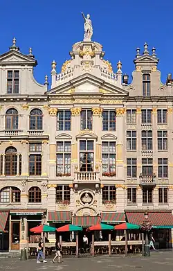 House of the Corporation of Carpenters | Former property of the Corporation of Carpenters, whose tools decorate the façade since the 15th century. Built in stone in 1644, partly spared by the bombardment, it was rebuilt (from the third floor up) and restored (lower levels and interior) in 1697 by the carpenter Antoine Pastorana.[9] The sculptures from this reconstruction are the work of Peter van Dievoet and Laurent Merkaert.[10] The façade was restored in 1854–1858 by the City of Brussels' architect, Victor Jamaer, and again in 1907–1913 by the architect Jean Segers.[9] Nowadays, a Starbucks coffee shop is located on the ground floor of this building. |