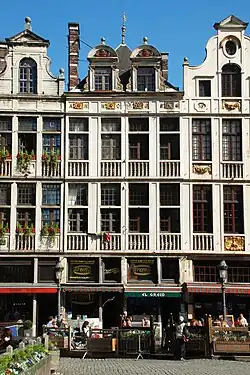 The Grand-Place/Grote Markt in Brussels, Belgium, is lined on each side with a number of guildhalls and a few private houses. At first modest structures, in their current form, they are largely the result of the reconstruction after the bombardment of 1695. The strongly structured façades with their rich sculptural decoration including pilasters and balustrades and their lavishly designed gables are based on Italian Baroque with some Flemish influences.[1][2] The architects involved in the new development were Jan Cosijn, Pieter Herbosch, Antoine Pastorana, Cornelis van Nerven, Guilliam or Willem de Bruyn[3][4] and Adolphe Samyn.[5][6][7]