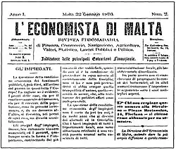 14. ^ a b c "In 1901 the first important Nationalist paper in Maltese, II-Poplu Malti, sold more than the Savonian Malta Ghada Taghna, and about twice as much as Emmanuele Dimech's Il-Bandiera tal-Maltin. The manner of language and approach of such papers was generally less inhibited, or more explicit - all too explicit at times - than was the case with either the Italian or English language Maltese papers. Socially, culturally and politically they were of the utmost importance and began to unravel a dimension of Maltese social life which had hitherto not come out into the open so much or at all." Henry Frendo, Maltese Journalism 1838-1992. A historical overview, Press Club Publications 1994, p.21