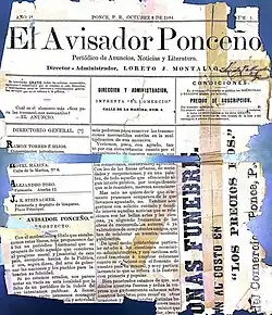 | El Ponceño: periódico literario mercantil y de avisos[33] | Ponce[34] | 1852 (Jul 10)[35] | 1854 (Jul 22)[35][b] | Microfilm and photocopies are available at the University of Puerto Rico at Ponce Adelina Coppin Alvarado Library (numbers 1–51 of 1852–1853 and numbers 50–108 of 1853–1854).[36] Print copies are available at UPR-JML Library (v.1, no.3 (Jul 1852) to v.3, no.108 (Jul 1854)).[33] | Ponce's first newspaper.[37][38][39][40][41][42] A weekly publication.[35] Daniel Rivera, founder.[43] |