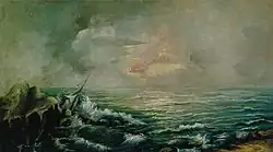 Tanner exposed to paintings at Earle's Galleries in Philadelphia. Spends summers in Atlantic City. | An early painting, done while learning, "probably derived from another artist's work".[7] | Ship in a Storm | Private collection. Oil on academy board 10'/16 x 6"(25.56 x 15.24 cm) | ![]() | |