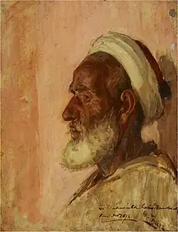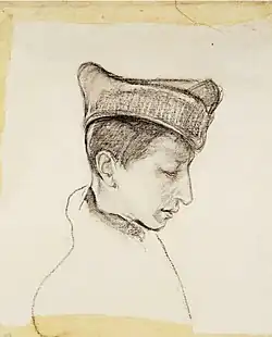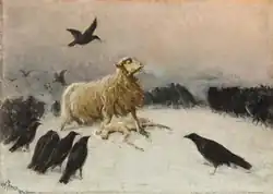 In a biographical article, Tanner wrote of his experience of owning and painting a sheep while at the Pennsylvania Academy of Fine Arts.[15] | Study of a sheep's head. Tanner switched his interest from marine painting to painting animals.[14] | Head of a Sheep[14] | Private collection. Oil on canvas, on board, 10 1/2x10 in. (267x254 mm)[14] | ![]() | |