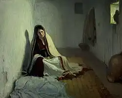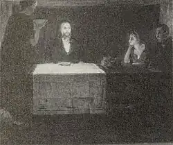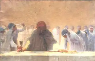 Beginning January 1891, attending school at the Academie Julian in Paris | Painted in France while attending school. Appears to be imitating the painting Anguish by August Friedrich Schenck. Tanner's painting is retitled, and painted in a more impressionist style. | Behold! The Lamb of God[53] | Private collection. Oil on canvas, 13.12 x 18.12 in. (33.3 x 46 cm.)[53] | ![]() |