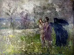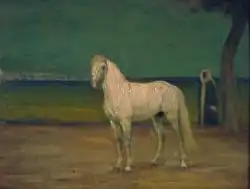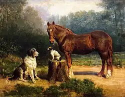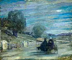 Beginning January 1891, attending school at the Academie Julian in Paris | Painted in France while attending school. The figure between the two dogs in the background is a pentimento of a gypsy boy, a street performer.[51] Tanner painted the petit savoyard (young Gypsy street performer) into the picture, but later removed it, creating the shadowy image.[51] | A Horse and Two Dogs in a Landscape[51] | Woodrow Wilson Middle School Collection, Philadelphia.[52] American realism or French academic | ![]() | |