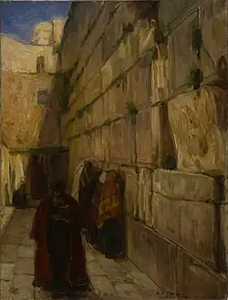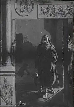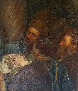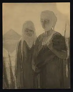 | 1882-1888[23][38] | While still living in Philadelphia, Tanner did a religious artwork.[23] This was years before The Thankful Poor and Daniel in the Lion's Den (1896).[23] His teacher may have been sending students' work in to magazines.[23] | Joachim, father of Mary, maternal grandfather of Jesus | Joachim Leaving the Temple[38] | The Baltimore Museum of Art, 2008.111. Opaque watercolor and graphite, inscribed with a stylus, on paper, 558 × 392 mm. (21 15/16 × 15 7/16 in.)[38] | ![]() | |