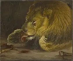 Tanner had been painting lions since at least 1880. He abandoned his project for Androcles and the lion as beyond his current abilities, but continued painting lions in works such as this.[29] | Lion Licking Its Paw or After Dinner[29] | Allentown Art Museum, 1962.5. Oil on canvas, 30 x 36" (76.2 x 91.44 cm)[29][31] | ![]() | ||