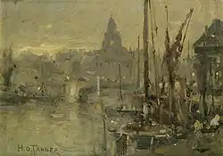 In 1872 he saw a painter painting a landscape in a park and was inspired to paint.[6] Tanner saw paintings at Earle's Galleries in Philadelphia.[6] He spent summers in Atlantic City. | In 1872 (age 13) he decides to become a marine painter. "Tanner's first known painting" was Harbor Scene.[7] This painting completed with no art education.[5] | Harbor Scene | Private collection. Oil on canvas board glued to Masonite. 14 x 20" (35.56 x 50.8 cm) | ![]() | |