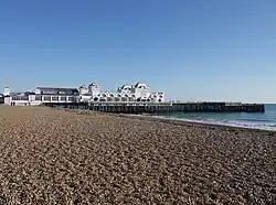 | Clarence Pier | Southsea | Hampshire | 1861 | 203 feet (62 m) | Three times wider than it is long, going along the beach rather than out to sea. The full pier is an amusement park. |