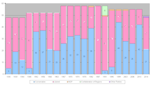 The chart on the upper right shows the information graphically, with the most recent elections towards the right. It shows that New Brunswick has effectively a two-party system – the Liberals (red) and the Conservatives (blue); along with the one-off success of the Confederation of Regions party (green) in 1991. It also shows the Liberal party's clean sweep of seats in 1987, one of the few instances in history when a party won all the seats in a national or sub-national legislature. Since provincial parties were officially recognized, the Liberal party have won eleven out of twenty elections.