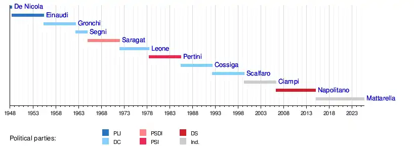 - ^ De Nicola was the only provisional president who had the title and not only the powers of provisional head of state. He assumed the office on 1 July 1946 and officially became the president of the Republic on 1 January 1948 as ordered by the new Constitution.