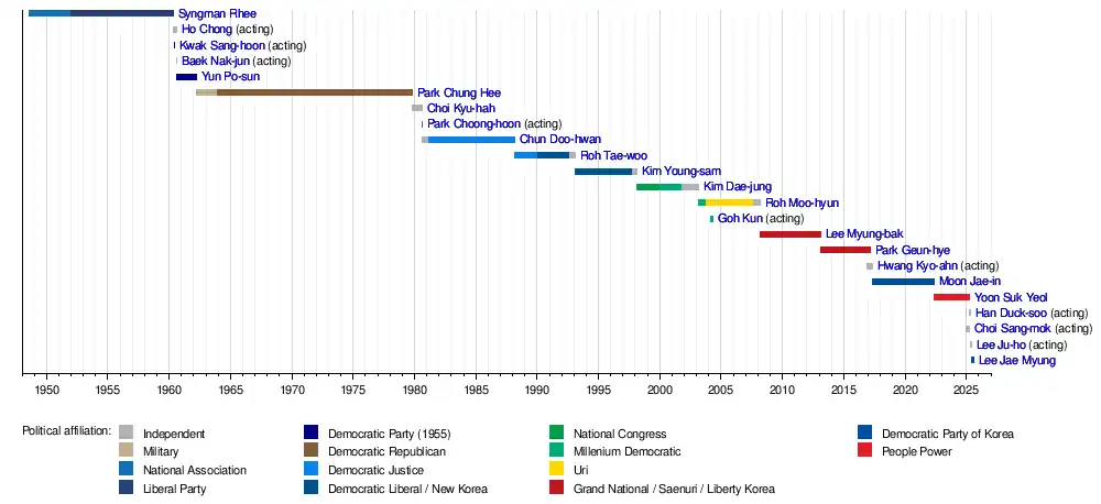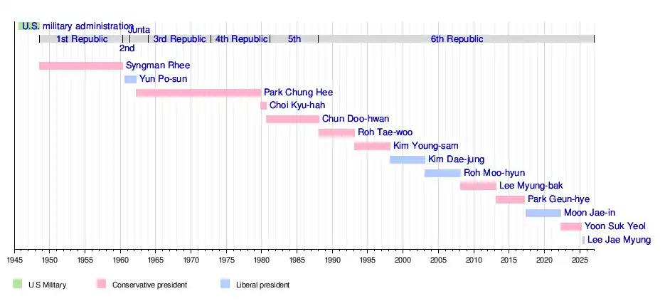 | Conservative | 9 | 21765 days | Choi Kyu-hah, Chun Doo-hwan, Kim Young-sam, Lee Myung-bak, Park Chung Hee, Park Geun-hye, Roh Tae-woo, Syngman Rhee, and Yoon Suk Yeol | |