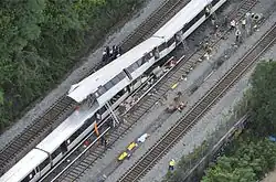 July 29 – United States – Kensington, Maryland: The eastbound Amtrak Capitol Limited, train 30, while traversing a CSX route, struck a sun kink while traveling at 60 mph (97 km/h). Several cars fell off an embankment and four Superliners overturned against trees. Sixteen people were seriously injured and 79 people suffered minor injuries. The misalignment was determined to be caused by an improperly tamped ballast and excessive speed in the 96 °F (36 °C) sunny weather. "Slow orders" were imposed on passenger trains in the area on very hot days following this accident.[29][30]