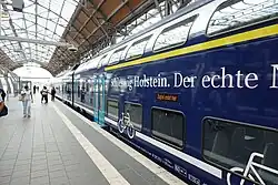 RE 74 Kiel Hauptbahnhof – Felde – Rendsburg – Owschlag – Schleswig – Jübek – Husum 134 60 min 1–2 × Stadler Flirt battery nordbahn