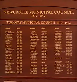 The first election was held at the Newcastle Court House on 15 February 1871 for seven members. The resident magistrate (W. J. Clifton) presided, and Arthur Edwardes Growse was elected as the district's first chairman.[7] Most elections from 1872 until the beginning of the 20th century were held on the third Friday in December in accordance with section 9 of the District Roads Act 1871. Later acts changed this to the third Thursday in March (Roads Act 1902) and the second Saturday in April (Road Districts Act 1919). Until 1919, chairmen were directly elected by ratepayers; after this, they were elected at the first meeting following an election by a majority of councillors.
