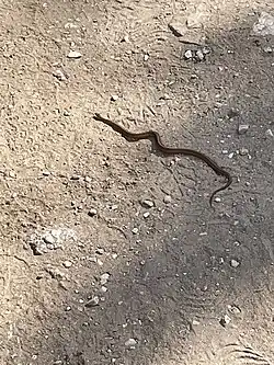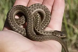 Wandering garter snake Thamnophis elegans vagrans[2] the Black Hills 18 - 30 inches in length, dull brown to greenish in colouration, yellow or orange mid-dorsal stripe on each side, a brown head (with yellow spots) and black bars on the lips