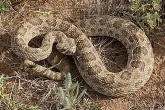 Prairie rattlesnake Crotalus viridis throughout that portion of the state west of the Missouri river, as well as in counties adjacent to the river's east bank 30 - 45 inches in length, South Dakota's only venomous snake (bite is potentially fatal to humans), readily identifiable by rattle segment(s) at the end of the tail, light brown to greenish in colouration, triangular-shaped head with pits located below the midline of each eye & nostril