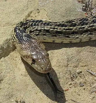 Plains hognose snake Heterodon nasicus throughout the state 15 - 25 inches in length, sharply upturned snout (as compared to the eastern hognose snake), dark blotches along center and sides of body, blackish underside