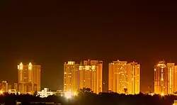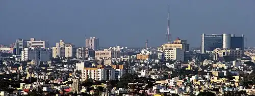 Unlike other metropolitan cities in the country, Chennai continues to experience a horizontal growth (that is, expanding continuously in its area) rather than a vertical growth by means of building more skyscrapers, owing to the presence of weather radar at the Chennai Port, which prohibits construction of taller buildings beyond its permissible limits.[2] The maximum permissible building height in Chennai was limited to 40 m until 1998, when it was increased to 60 m.[3][4][5] This restriction continued until the second master plan of the Chennai Metropolitan Development Authority was rolled out in 2008, after which the restriction was lifted, allowing buildings taller than 60 meters to be built.[6][7] Until then, the LIC Building on Anna Salai, with 15 floors, dominated the city's skyline for almost four decades. Even the next tallest building, a 10-storied residential tower of the Tamil Nadu Housing Board (TNHB) at Nandanam, was not built until almost a decade later in 1968.[8] However, after the big companies started building tall concrete structures in the city in the first and second decades of the twenty-first century, the skyline started changing, especially along the periphery,[9] and more so in south Chennai along the Old Mahabalipuram Road, Egattur, Perumbakkam, and the East Coast Road.[7] According to realty portal Commonfloor.com, as of 2014, there were 96 high-rises (buildings with 10 or more storeys) and 148 buildings under construction or planned.[7]
